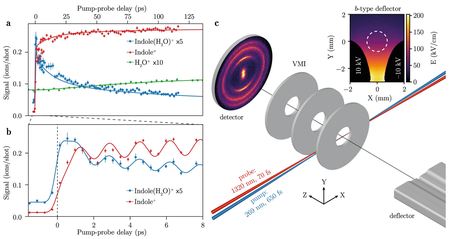 Interactions between proteins and their solvent environment can be studied in a bottom-up approach using hydrogen-bonded chromophore-solvent clusters. The ultrafast dynamics following UV-light-induced electronic excitation of the chromophores, potential radiation damage, and their dependence on solvation are important open questions. The microsolvation effect is challenging to study due to the inherent mix of the produced gas-phase aggregates. We use the electrostatic deflector to spatially separate different molecular species in combination with pump-probe velocity-map-imaging experiments. We demonstrate that this powerful experimental approach reveals intimate details of the UV-induced dynamics in the near-UV-absorbing prototypical biomolecular indole-water system. We determine the time-dependent appearance of the different reaction products and disentangle the occurring ultrafast processes. This approach ensures that the reactants are well-known and that detailed characteristics of the specific reaction products are accessible – paving the way for the complete chemical-reactivity experiment. Onvlee, J., Trippel, S. & Küpper, J. | ![]() |