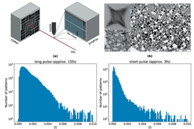 With the development of X-ray free-electron lasers (XFELs), producing pulses of femtosecond durations comparable with the coherence times of X-ray fluorescence, it has become possible to observe intensity–intensity correlations due to the interference of emission from independent atoms. This has been used to compare durations of X-ray pulses and to measure the size of a focusedX-ray beam, for example. Here it is shown that it is also possible to observe the interference of fluorescence photons through the measurement of the speckle contrast of angle-resolved fluorescence patterns. Speckle contrast is often used as a measure of the degree of coherence of the incident beam or the fluctuations of the illuminated sample as determined from X-ray diffraction patterns formed by elastic scattering, rather than from fluorescence patterns as addressed here. Commonly used approaches to estimate speckle contrast were found to suffer when applied to XFEL-generated fluorescence patterns due to low photon counts and a significant variation of the excitation pulse energy from shot to shot. A new method to reliably estimate speckle contrast under such conditions, using a weighting scheme, is introduced. The method is demonstrated by comparing the speckle contrast of fluorescence observed with pulses of 3 fs to 15 fs duration. Fabian Trost, Kartik Ayyer, Dominik Oberthuer, Oleksandr Yefanov, Saša Bajt, Carl Caleman, Agnes Weimer, Artur Feld, Horst Weller, Sébastien Boutet, Jason Koglin, Nicusor Timneanu, Joachim von Zanthier, Ralf Röhlsberger and Henry N. Chapman | ![]() |