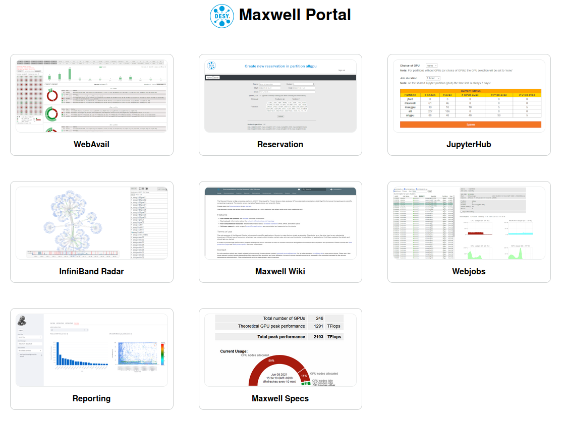 We have implemented a number of services around the maxwell cluster. The services are directly accessible through the Maxwell Portal, which is currently not accessible from outside the DESY network. The snapshots below will get you to the corresponding service, the titles to the documentation (where available).