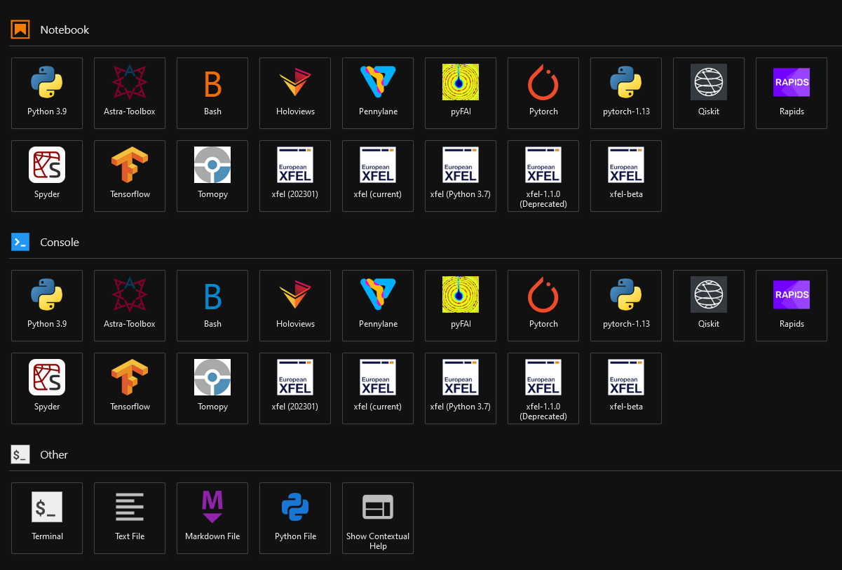 Jupyter kernels now reside in /software/jupyter/share/kernels/. Selection of kernels are identical for conda/3.11 and conda/3.9 environments. The jupyterhub will only see the latest version for a particular application like tensorflow, but you can easily enable any kernel if needed. The selection of kernels will roughly look like shown in the image. EuXFEL kernels will only show if you are a member of groups exfel or upex. JupyterLab has no way to organize kernels into categories or things alike. You can however whitelist the kernels you really need. See Configuring Jupyter Kernels for more details. Please contact maxwell.service@desy.de if